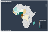 | PAYS | NOMBRE DE PRÉSIDENTS | LONGÉVITÉ AU POUVOIR (ANNÉES) | PLUS COURTE DURÉE (MOIS) | PRÉSIDENTS À LA RETRAITE | PRÉSIDENT EN 2 TEMPS (quitter le pouvoir pour revenir après une première retraite) | |||